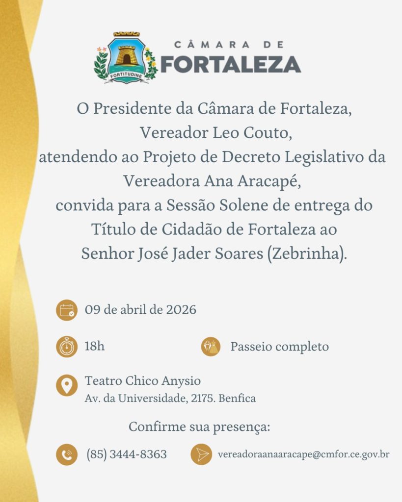 No ano e mês em que Fortaleza comemora 300 anos, o humorista Jader Soares(Zebrinha) receberá o título de cidadão fortalezense. A iniciativa é da vereadora Ana Aracapé que diz que esta outorga é “em reconhecimento à sua relevante contribuição cultural e social para o município de Fortaleza”.