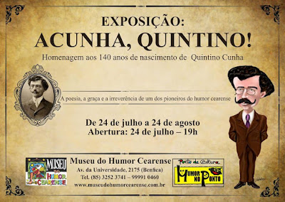 Então para comemorar esta data fechada, o Museu do Humor Cearense promove a Exposição Acunha, Quintino! Na ocasião da abertura da exposição haverá uma roda de conversa com poesias, causos e piadas sobre o poeta. Participarão da conversa, o humorista Jader Soares, diretor do Museu, os escritores Arievaldo Viana e Raymundo Netto. Detalhe: quem estiver presente pode dar pitaco, contar causo; afinal, será uma festa quintiniana. A hora é de falarmos da poesia, da graça e da irreverência de um dos pioneiros do humor cearense. Se aprochegue!