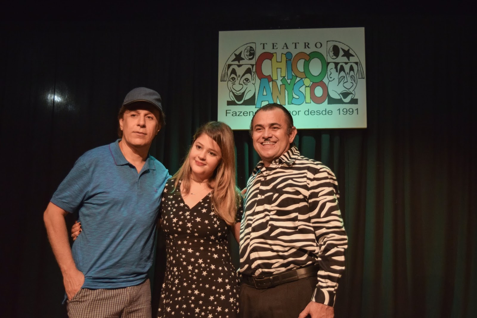 Tom Cavalcante, Maria Antônia e Jader Soares no palco do Teatro Chico Anysio